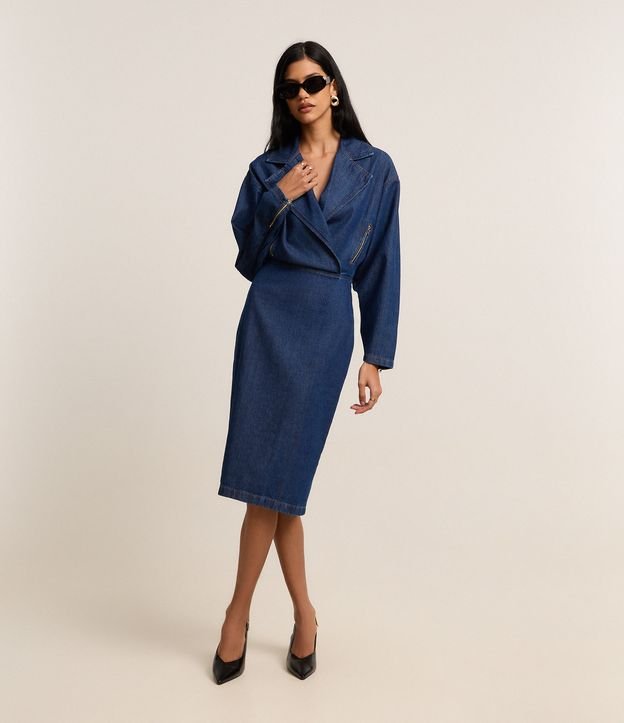 Vestido Curto em Jeans com Gola Lapela e Saia Lápis