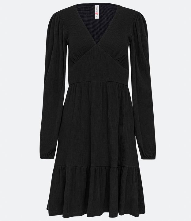 Vestido Curto em Malha Texturizada com Decote V Preto