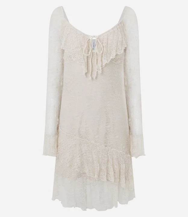 Vestido Curto em Renda com Manga Longa e Babados Off White