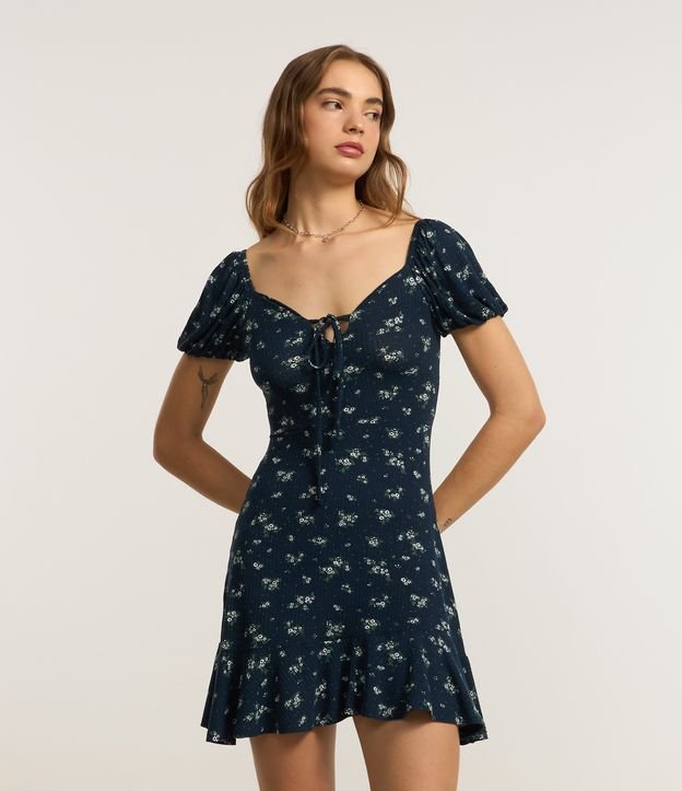Vestido Curto em Ribana com Estampa Floral Liberty Azul Marinho