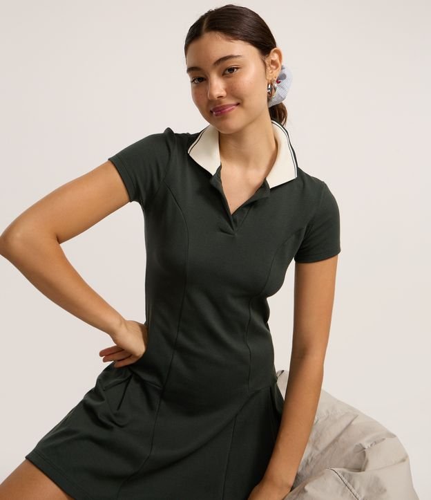 Vestido Curto em Ribana com Gola Polo Contrastante Verde