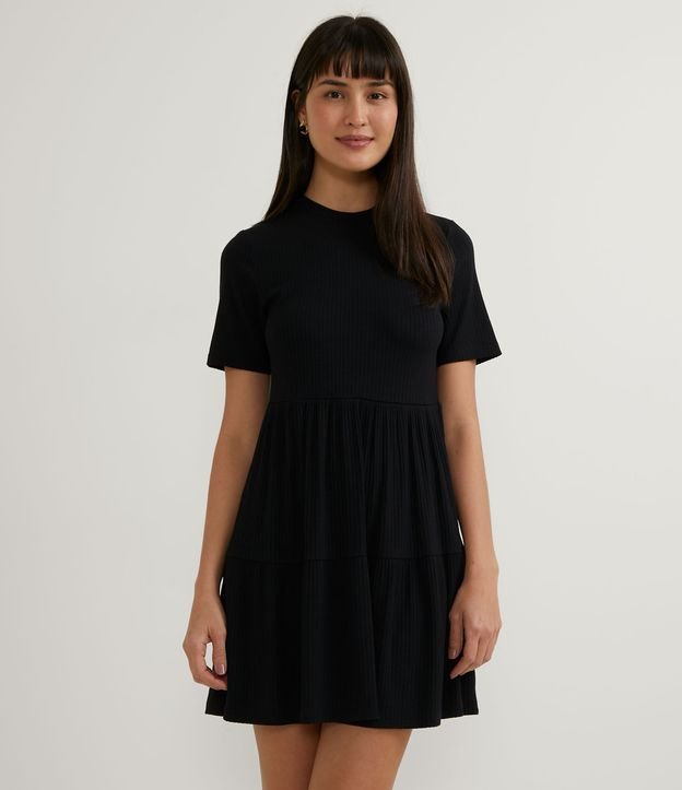 Vestido Curto em Ribana com Manga Curta e Babados na Saia