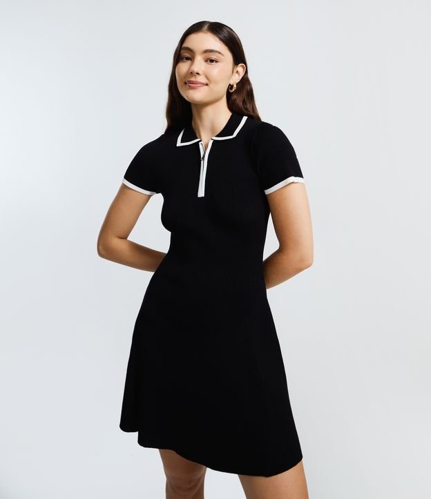 Vestido Curto em Tricô com Gola Polo e Viés Contrastantes Preto