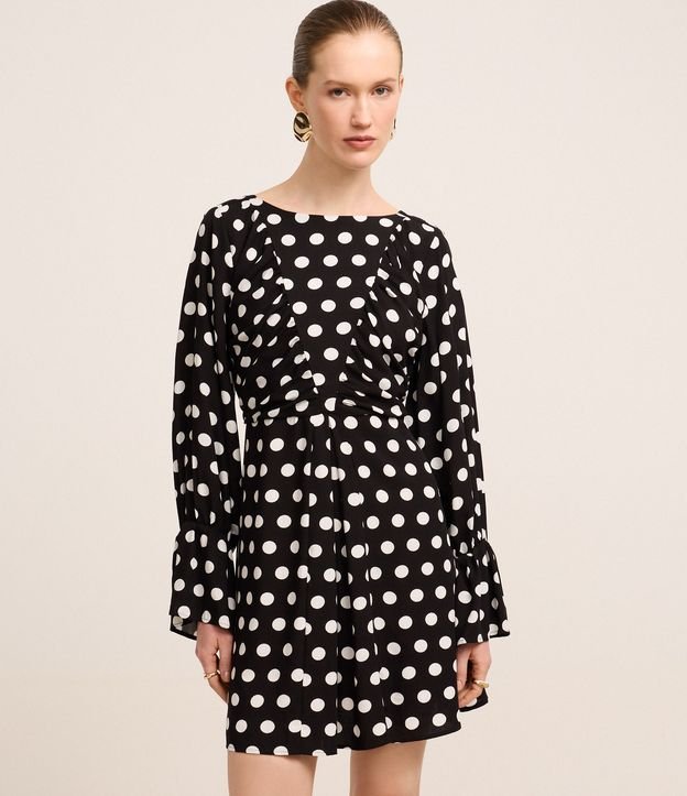 Vestido feminino curto com gola redonda, recortes, manga longa com sino na barra, estampa poá e decote nas costas.