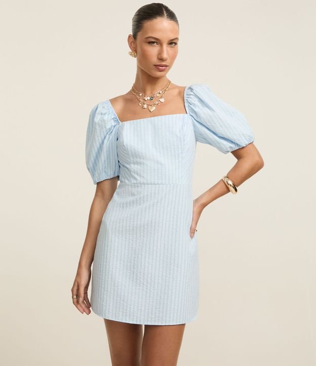 Vestido Curto em Tricoline Listrado com Manga Bufante e Brilhinhos Azul
