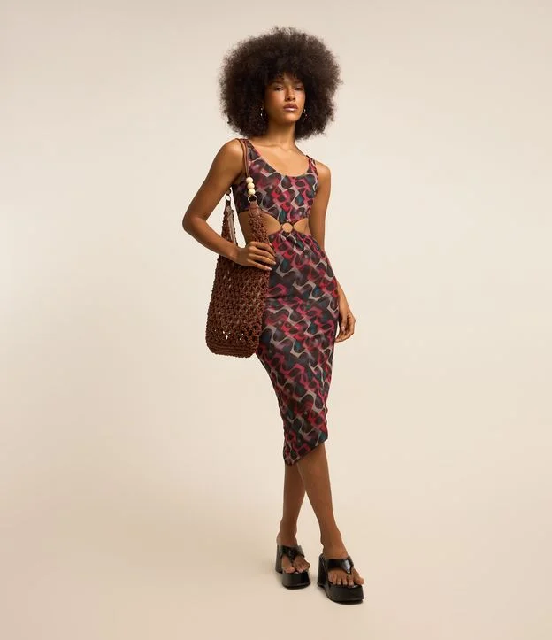 Vestido curto com alça larga, justinho com argola e recorte vazado na cintura com estampa abstrata.