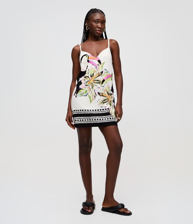 Vestido Curto em Viscolinho com Alcinhas e Estampa de Tucano Branco