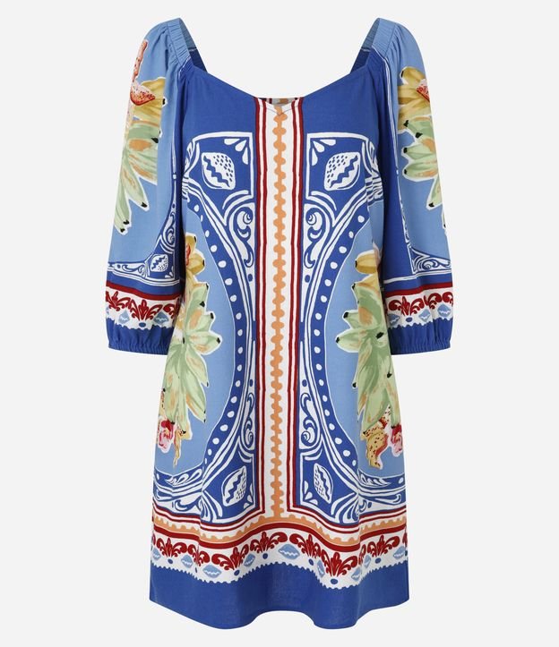 Vestido Curto em Viscolinho com Estampa de Frutas Azul