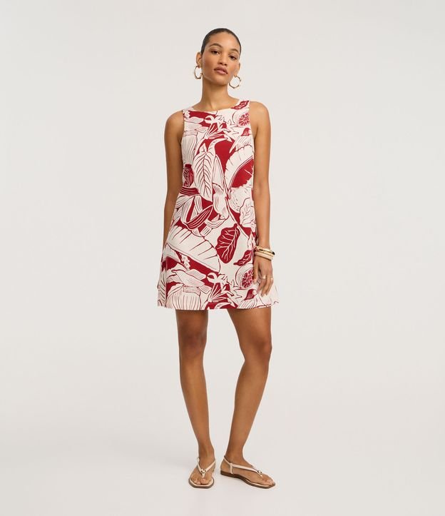 Vestido Curto em Viscolinho com Estampa Folhagem e Limões Vermelho