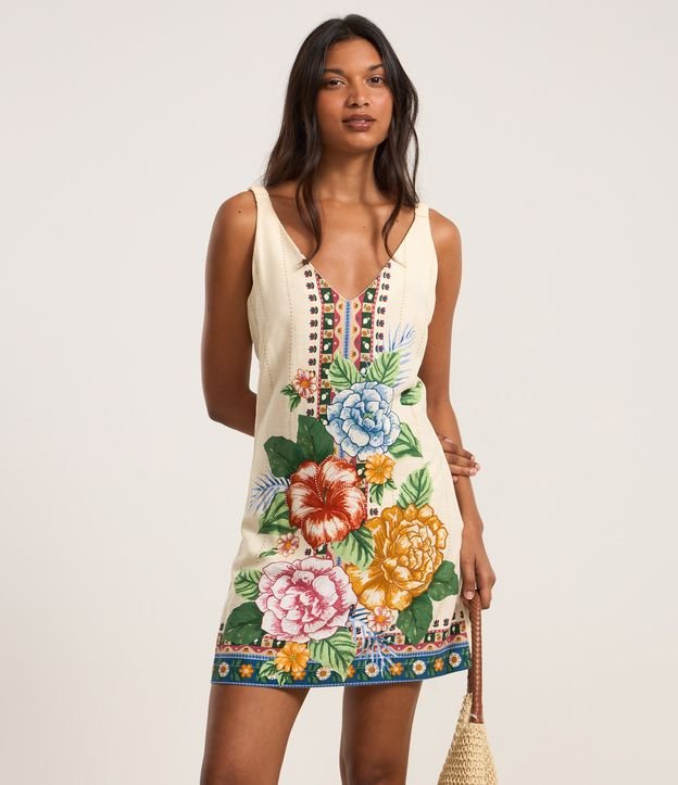 Vestido Curto em Viscose com Linho e Estampa Floral Bege