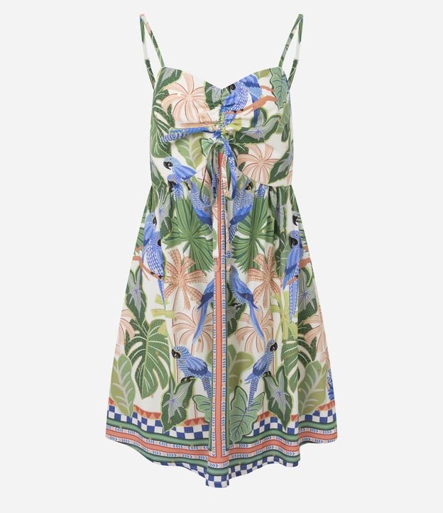 Vestido Curto em Viscose Estampa Tropical com Amarração no Busto Verde