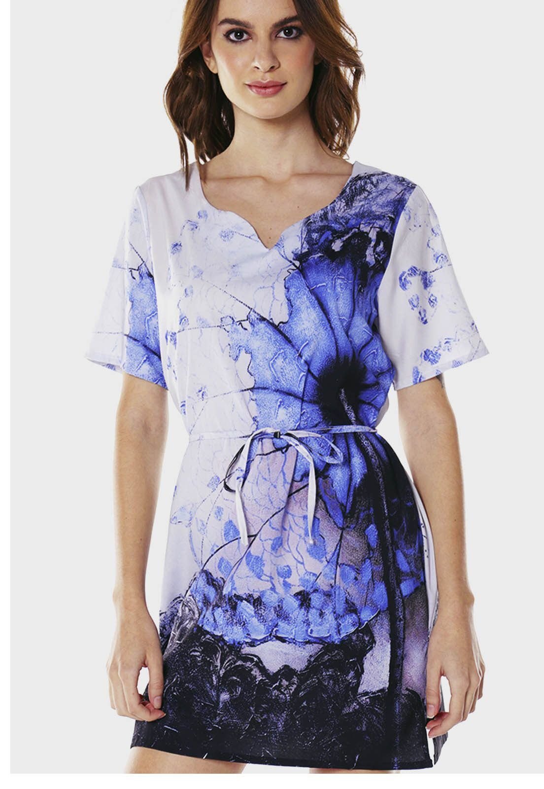 Vestido Curto Estampado Solto Mangas Curtas Gola V Under79 Azul
