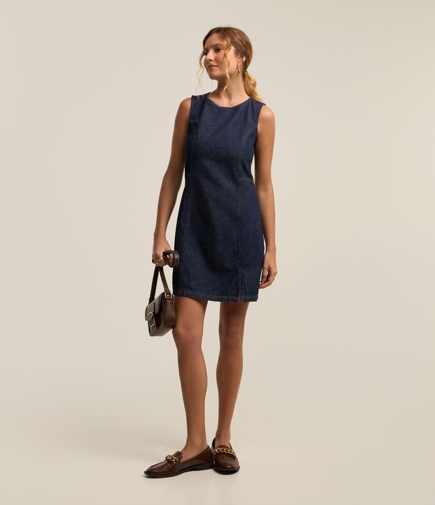 Vestido Curto Jeans com Recortes e Zíper nas Costas Azul