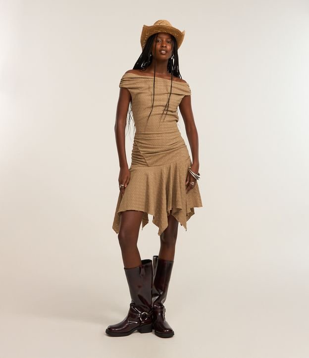 Vestido Curto Texturizado Ombro a Ombro e com Barra em Pontas Bege