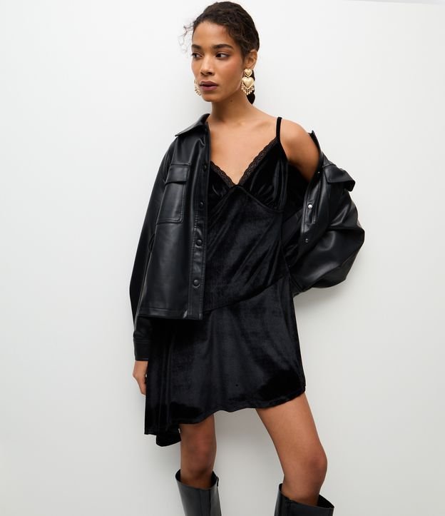 Vestido de Alcinha em Veludo com Decote Rendado e Barra Assimétrica Preto