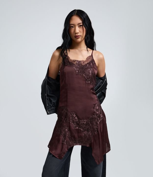 Vestido feminino confeccionado em cetim, possui decote v, alças finas ajustáveis e detalhes em renda.