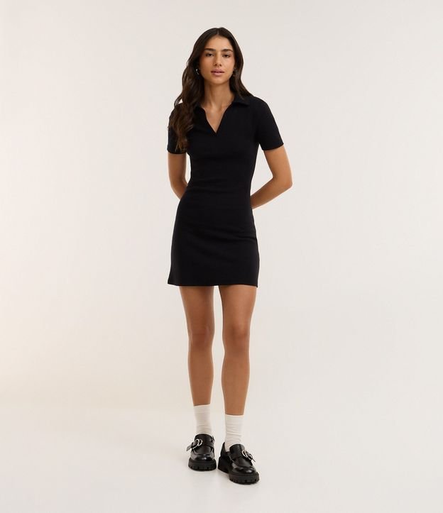 Vestido em Ribana com Gola Polo Preto