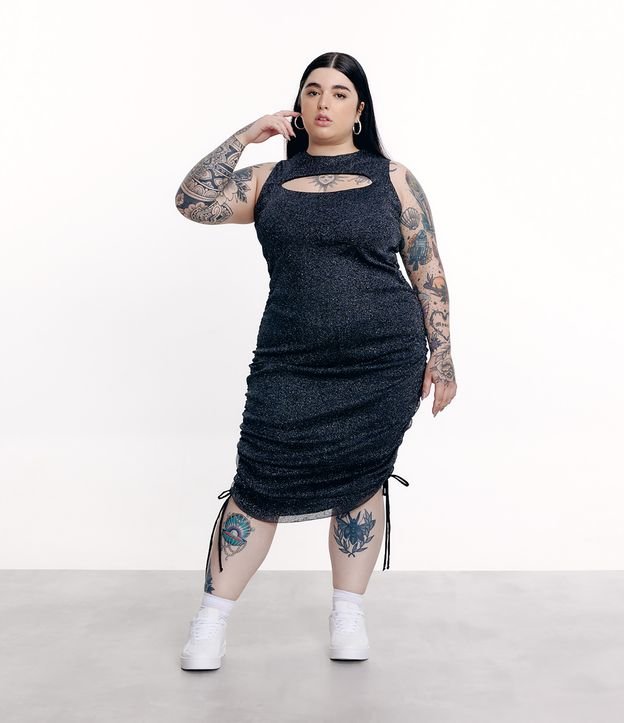 Vestido em Tule com Glitter Recorte Vazado e Franzido Lateral Curve & Plus Size