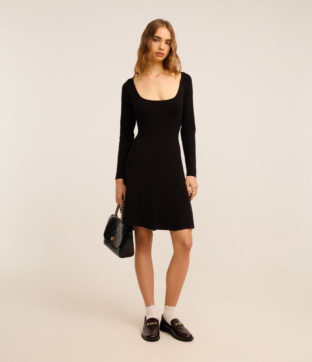 Vestido Evasê Curto Canelado em Tricô com Decote Quadrado Preto