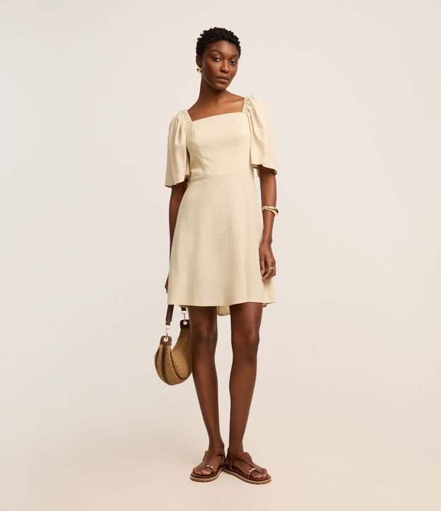 Vestido Evasê Curto em Viscolinho com Manga Godê Bege