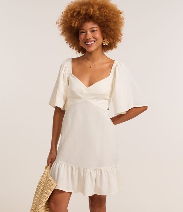 Vestido feminino curto de modelo evasê, com decote V e mangas curtas amplas. A peça é confeccionada em viscolinho, sem estampa, possui recorte vazado nas laterais da cintura e babado na barra.