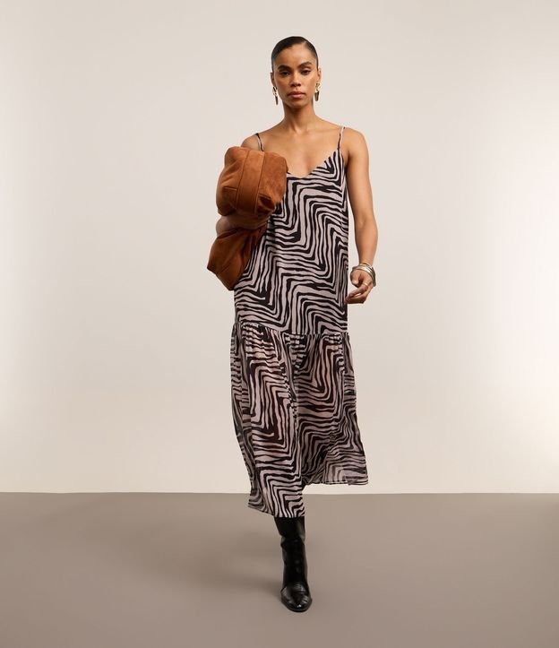 Vestido Evasê em Crepe com Alça Fina e Estampa Zebra Preto/Cinza