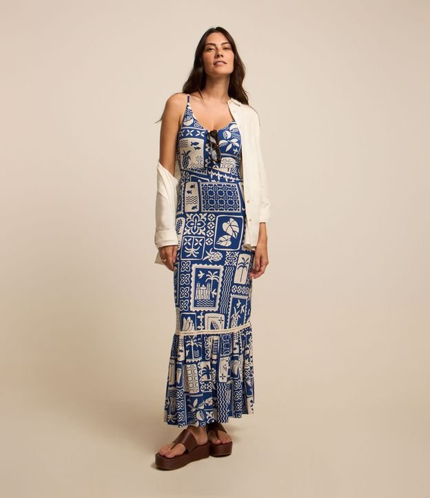 Vestido evasê long midi de alcinhas finas reguláveis com decote V, elástico na cintura, recorte com entremeio na barra e franzidos que com efeito de babados além de estamparia de ícones tropicais em estilo de azulejo em ícones contrastantes. Confeccionado em viscose mais sustentável.