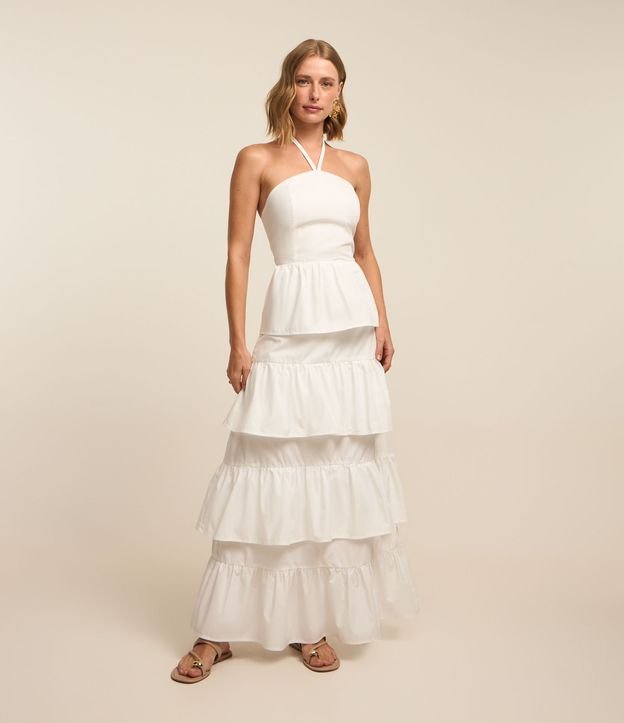 Vestido Evasê Longo em Tricoline com Babados Sobrepostos Branco