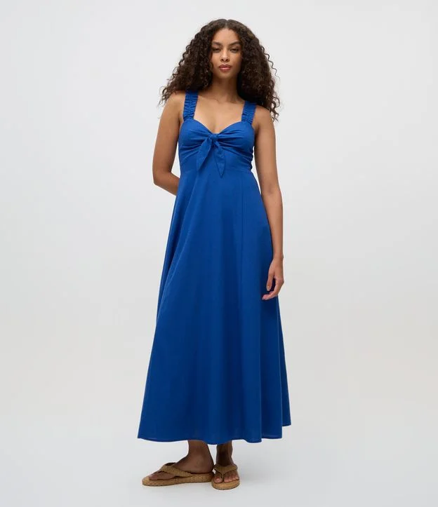Vestido Evasê Longo em Viscolinho com Laço no Busto Azul
