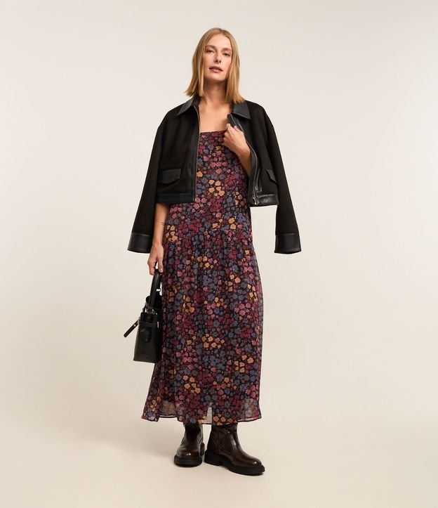Vestido evasê de comprimento midi, confeccionado em chiffon através de boas práticas ambientais, com decote reto e alcinhas finais reguláveis. Peça tem barra com recorte franzido e estampa floral liberty.