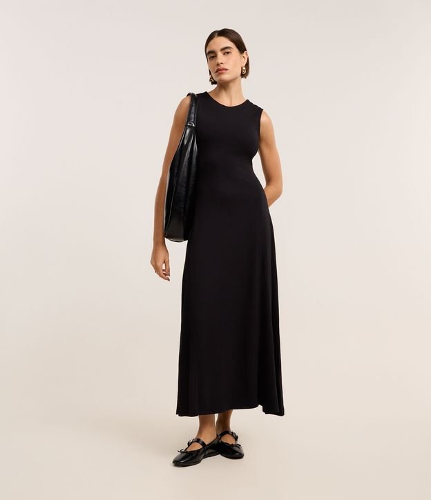 Vestido evasê de comprimento midi, confeccionado em ponto roma com viscose mais sustentável através de boas práticas ambientais. Peça não possui mangas e tem gola redonda.