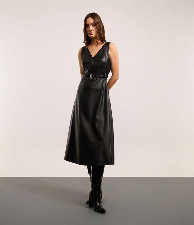 Vestido evasê midi, sem mangas, confeccionado em PU, com decote V no busto e bas costas, recortes com costura aparente no tronco e cinto estreito com fivela metalizada.