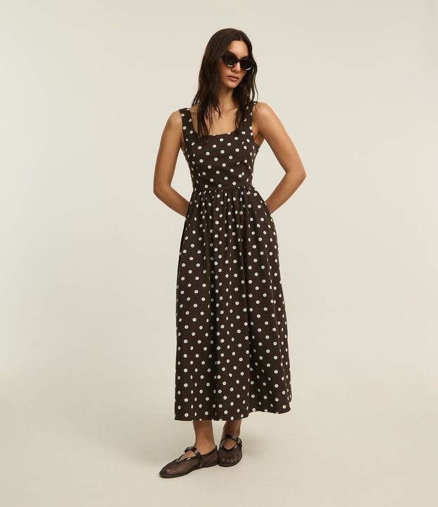 Vestido Evasê Midi em Tricoline com Estampa Poá