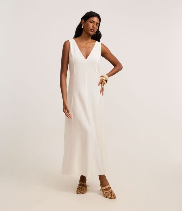 Vestido Evasê Midi em Viscolinho com Decote V e Pences Off White