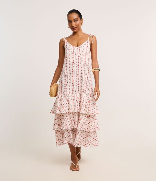 Vestido evasê midi, sem mangas, de alças finas, confeccionada em viscolinho, com decote V, barra franzida com grandes babados e estampa floral liberty. Este produto possui viscose certificada em sua composição, sendo ambientalmente mais responsável.