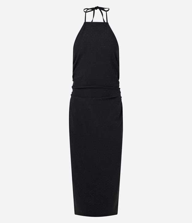 Vestido feminino confeccionado em bengaline de viscose mais sustentável, com modelagem halter reta e comprimento abaixo do joelho, apresentando decote degagê que valoriza o colo e amarração no pescoço, além de aplicação delicada de brilho pontilhado ao longo da peça, ideal para composições glamourosas em festas, eventos noturnos e happy hours com elegância e sofisticação.