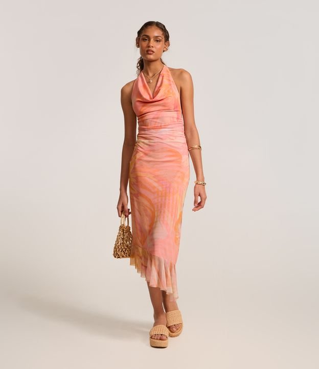 Vestido Frente Única em Tule com Estampa Floral e Decote Degagê Salmão