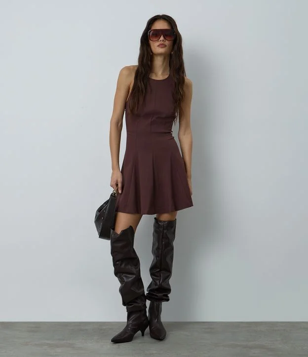 Vestido Frente Única Evasê em Bengaline Marrom