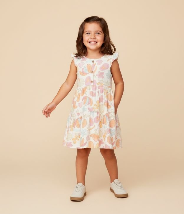Vestido infantil confeccionado em algodão mais sustentável através de boas práticas ambientais. Possui gola redonda, cava com frufru, botões frontais, babados, estampa floral e texturizado.