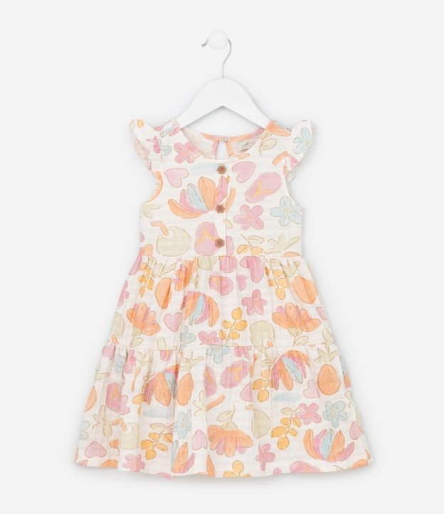 Vestido infantil confeccionado em algodão mais sustentável através de boas práticas ambientais. Possui gola redonda, cava com frufru, botões frontais, babados, estampa floral e texturizado.