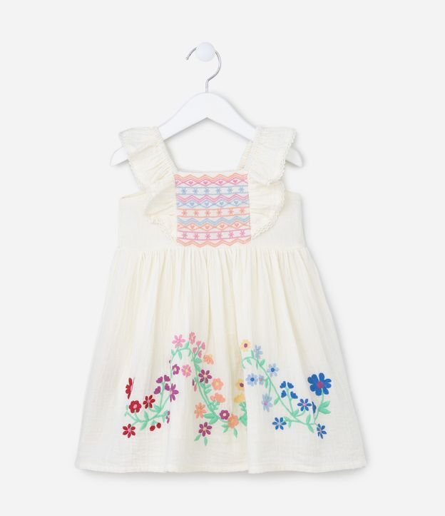 Vestido Infantil em Ana Ruga com Bordado Floral - Tam 1 a 5 anos