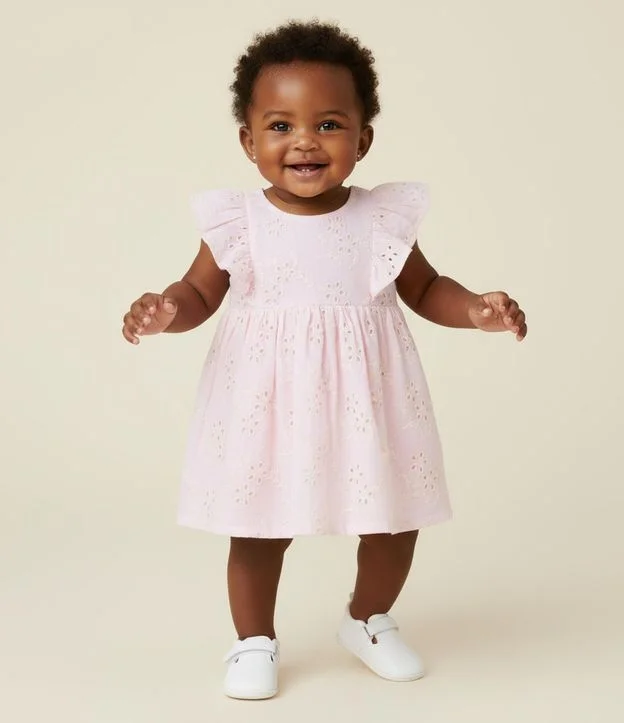 Vestido Infantil em Broderie com Babadinhos e Calcinha - Tam 3 a 18 Meses