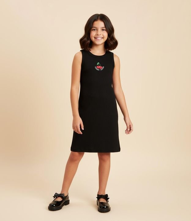 Vestido Infantil em Ribana com Estamoa Cereja - Tam 5 a 14 Anos Preto