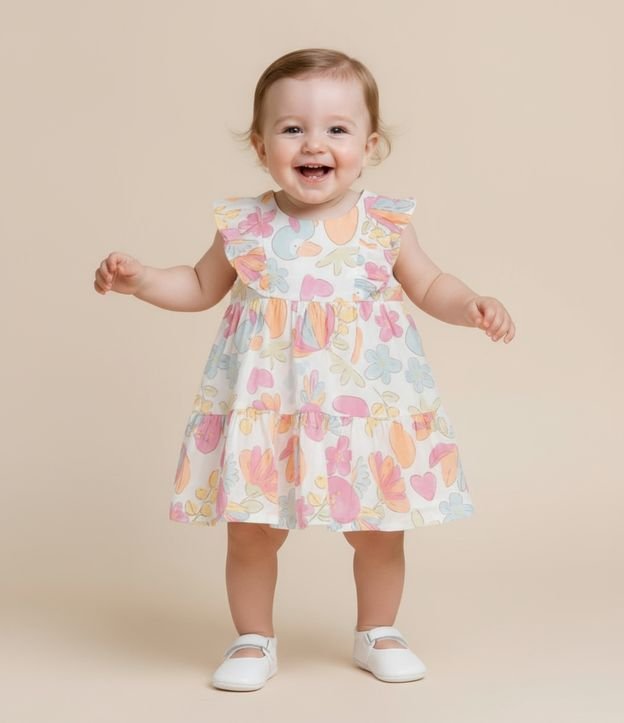 Vestido infantil confeccionado em tricoline mais sustentável. Possui gola redonda, babadinhos na manga, estampa de flores e pássaros. Acompanha calcinha.