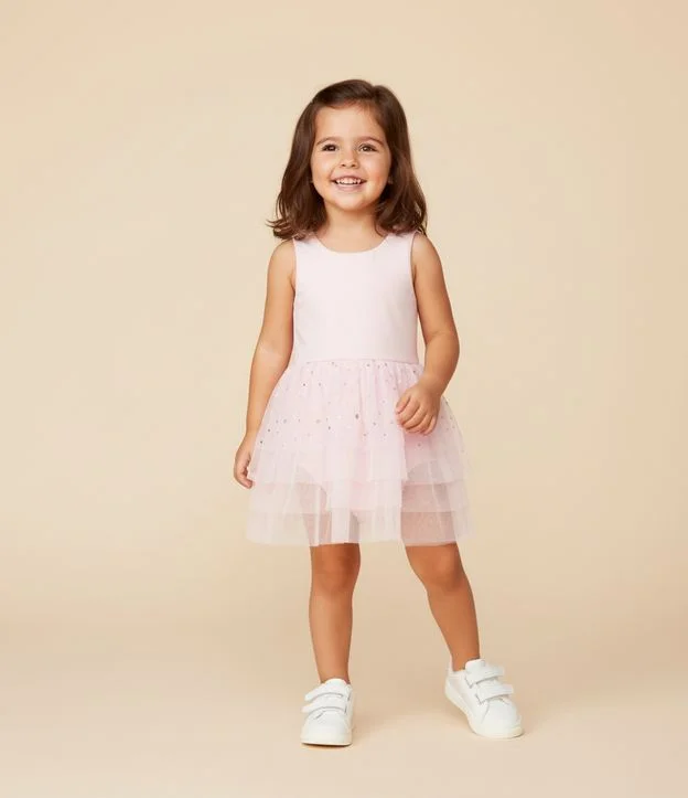 Vestido infantil sem manga com corpo liso e modelagem reto, confeccionado em material leve. Possui saia em tule com camadas e glitter, criando volume delicado no estilo bailarina, além de body interno com botões para maior praticidade no vestir.