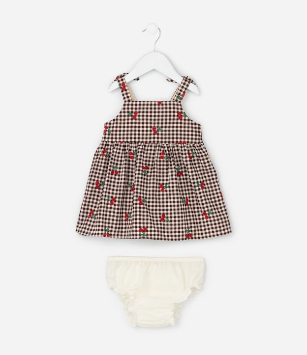 Vestido Infantil Xadrez em Tricoline com Bordados e Calcinha – Tam 0 a 18 Meses Marrom/Bege