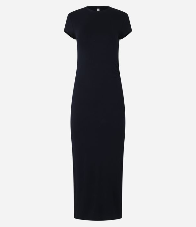 Vestido feminino de modelo long midi, com gola redonda, mangas curtas e fenda e franzido lateral. Peça confeccionada em moletinho.