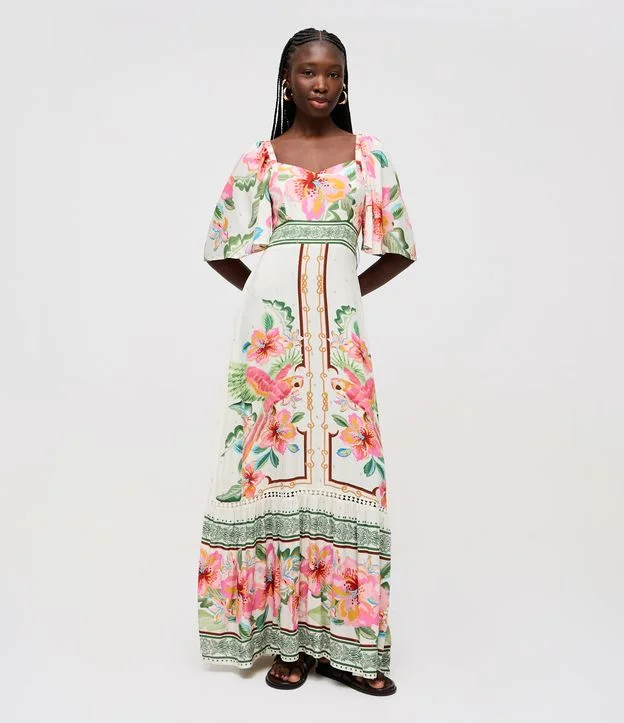 Vestido feminino midi confeccionado em viscose certificada. Possui modelagem alongada, decote levemente arredondado, mangas amplas com leve volume e estampa floral localizada.