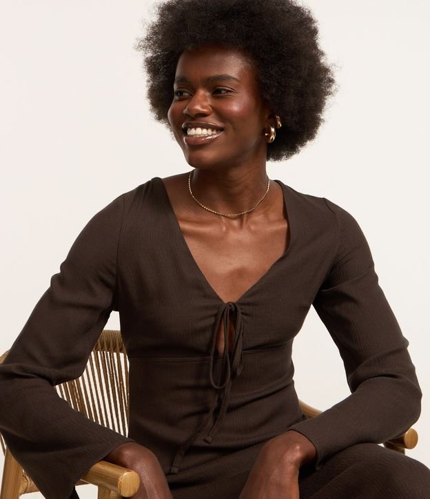 Vestido Long Midi com Textura Maquinetada e Manga Flare Marrom