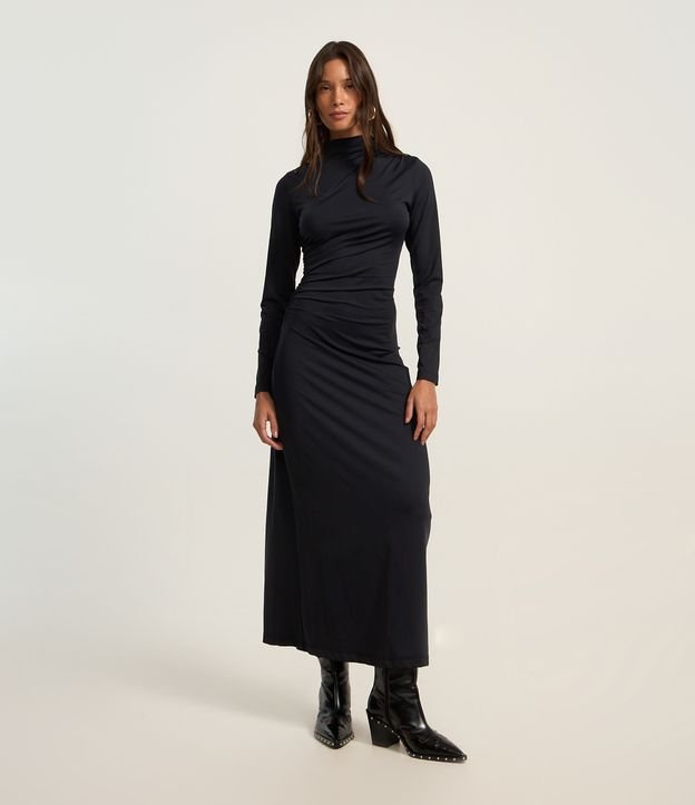 Vestido Long Midi em Microfibra com Golinha Alta e Franzidinho Lateral Preto